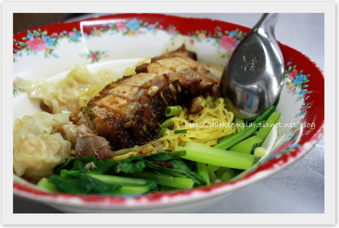 燒肉鮮蝦餛飩麵,非常泰國的味道,泰銖六十元(也就是台幣六十元),每次都點這個,沒有例外,因為餛飩非常的優,往下看就知道。