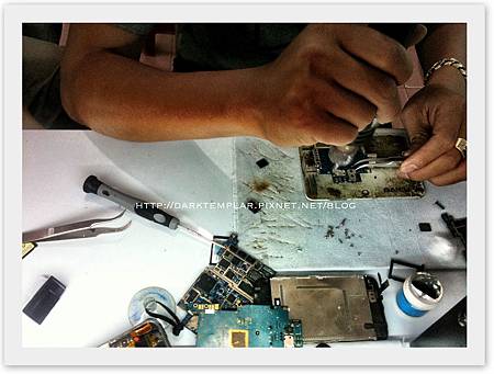 那是一家只賣蘋果手機的蘋果店,很小的店面,裡面除了老闆還有其他三個員工。蘋果老闆看到奧男就搖了搖頭,看到我在後面就愣了一下然後只好微笑了。我好像也沒有說到話吧,我們就通通坐下來然後他就開始修奧男的手機了。全程又拖了超久,我只有中間離開一下幫大家買飲料,然後就看他們修手機或是上網。經過我的觀察,原來他這家店就是專門解體及組裝阿鳳的。因為實在太無聊,我就開始問老闆很多問題(他只有在電話整支拆開然後要焊主機片上一個東西的時候跟我「噓」了一聲,其他時候都有回應我),問他零件哪裡來的,這家店開多久之類的。他說零件都是大陸工廠流出來他們以低價買進的,目前順化只有他這家專門賣阿鳳的店,他未來也想開分店,連下家店的藍圖都畫好了,現在只需要存錢。我瞄了一下店裡的價目表,哇噻還真會賺,低價買進零件自己組裝,然後賣原價!有你的!!